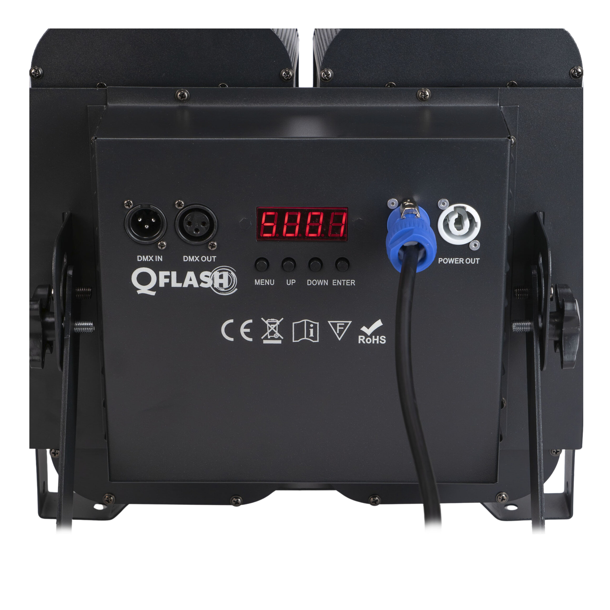 The QFlash COB 400 features 3-pin XLR connectors for DMX input and output, ensuring seamless integration into professional lighting systems. It offers two DMX channel modes (4 and 8 channels), with dimmer control, strobe speed adjustment, and support for Master/Slave and Automatic operation modes.